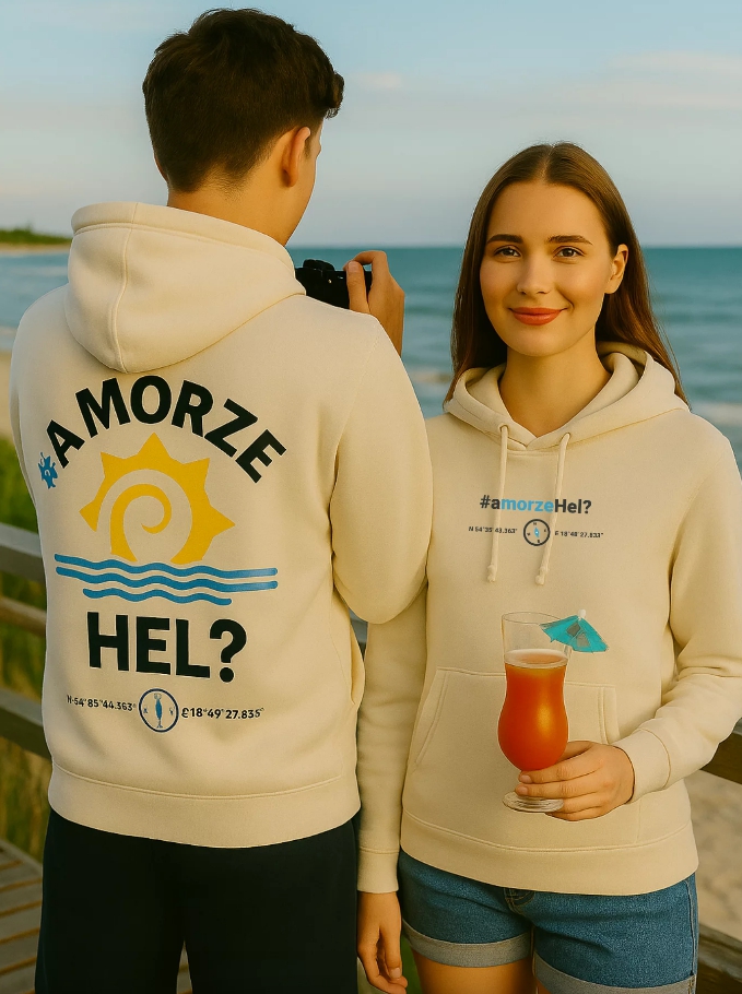 Gruba, mięsista bawełna ochroni przed morską bryzą, a kaptur przyda się, gdy pogoda pokaże swoje kapryśne oblicze. Hasło "A Morze Hel" to klasyk, który rozumieją wszyscy zakochani w Półwyspie. Na cieplejsze dni polecamy naszą koszulkę z helskim motywem – idealną na lody przy porcie.
